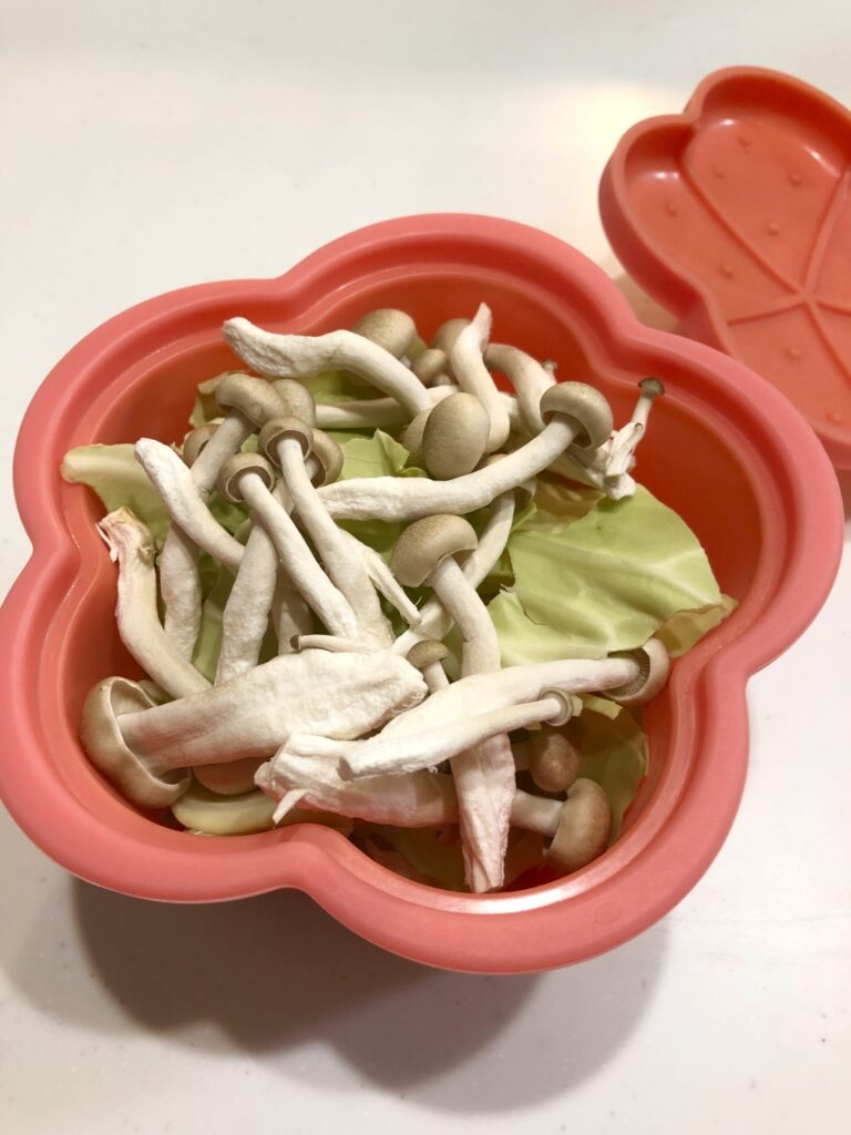 それをベースにして、前日の夜にほかの野菜やきのこを足して、シリコンスチーマーに入れておきます。