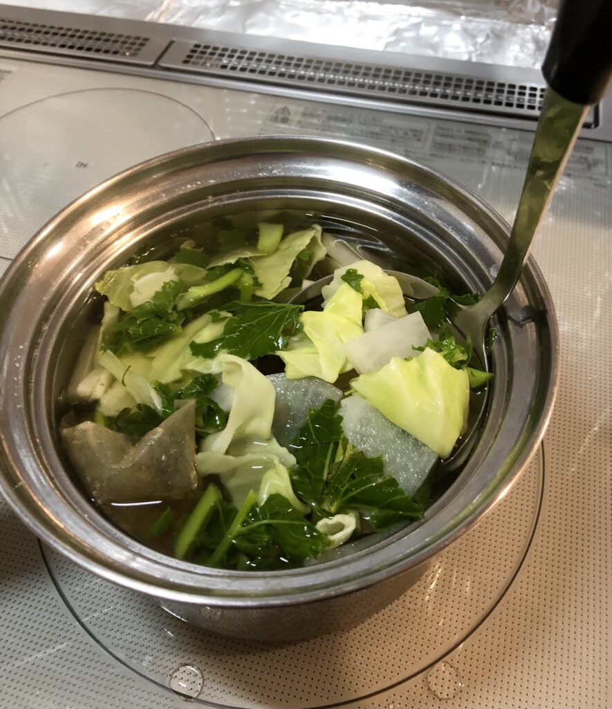 わが家では、写真のように小鍋がギチギチになるぐらい野菜を入れます(笑)