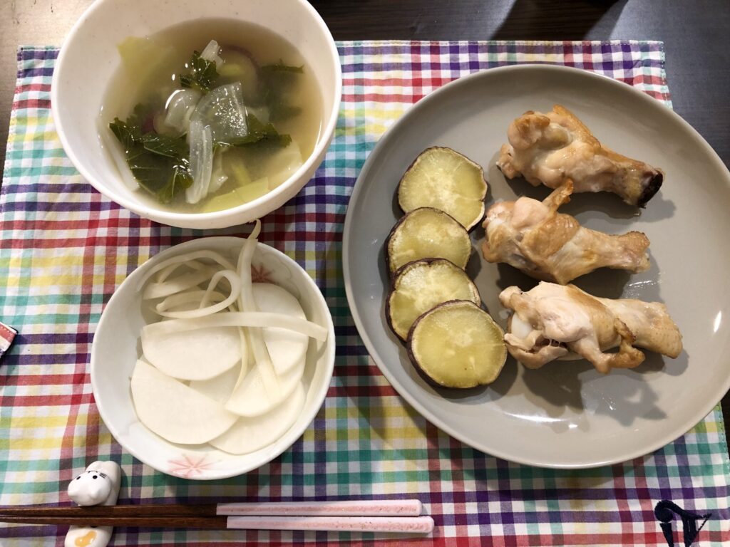 大根のぬか漬け、大根・大根の葉・さつまいも・キャベツの味噌汁、手羽元とさつまいもを焼いたものです。
